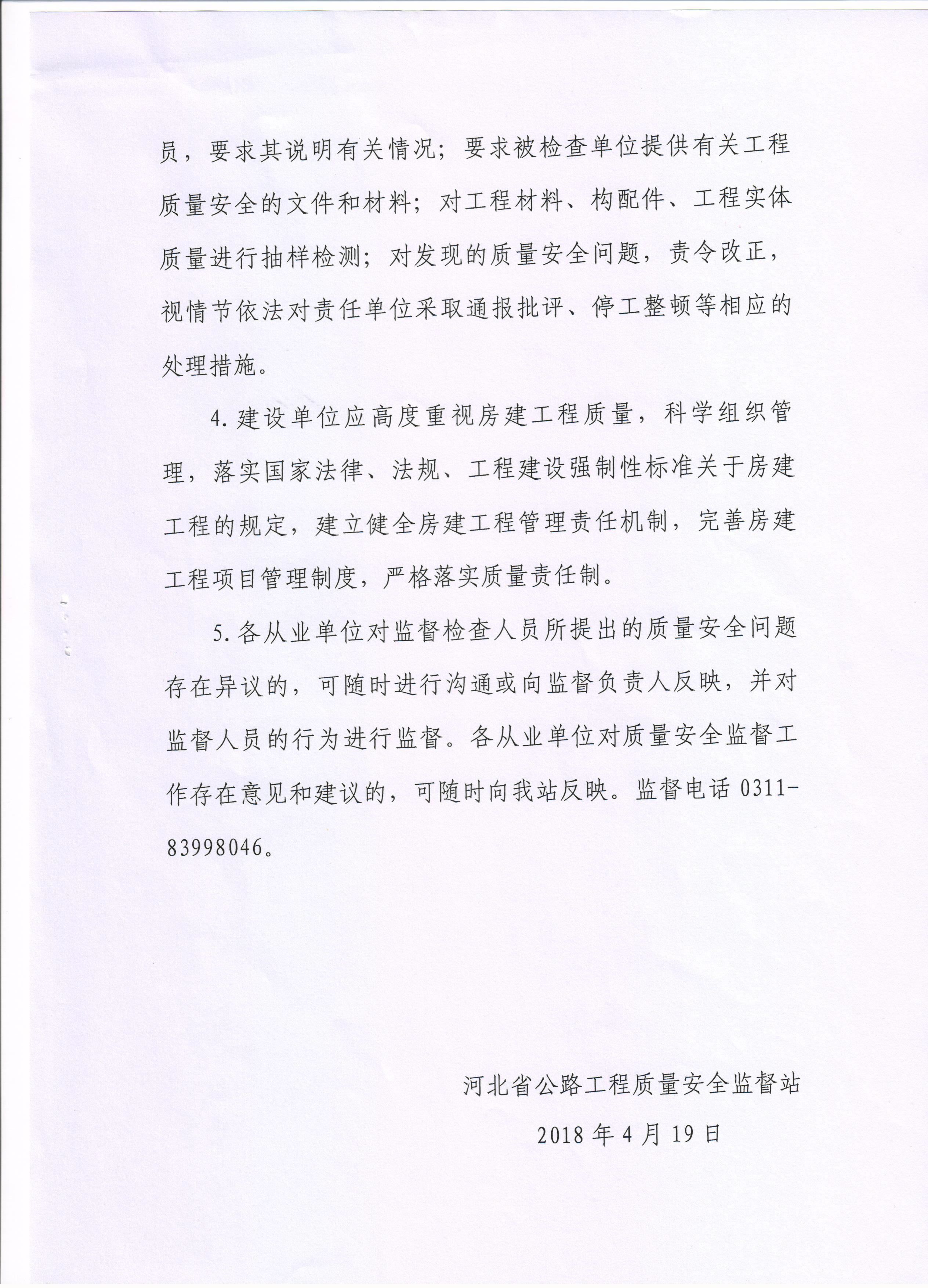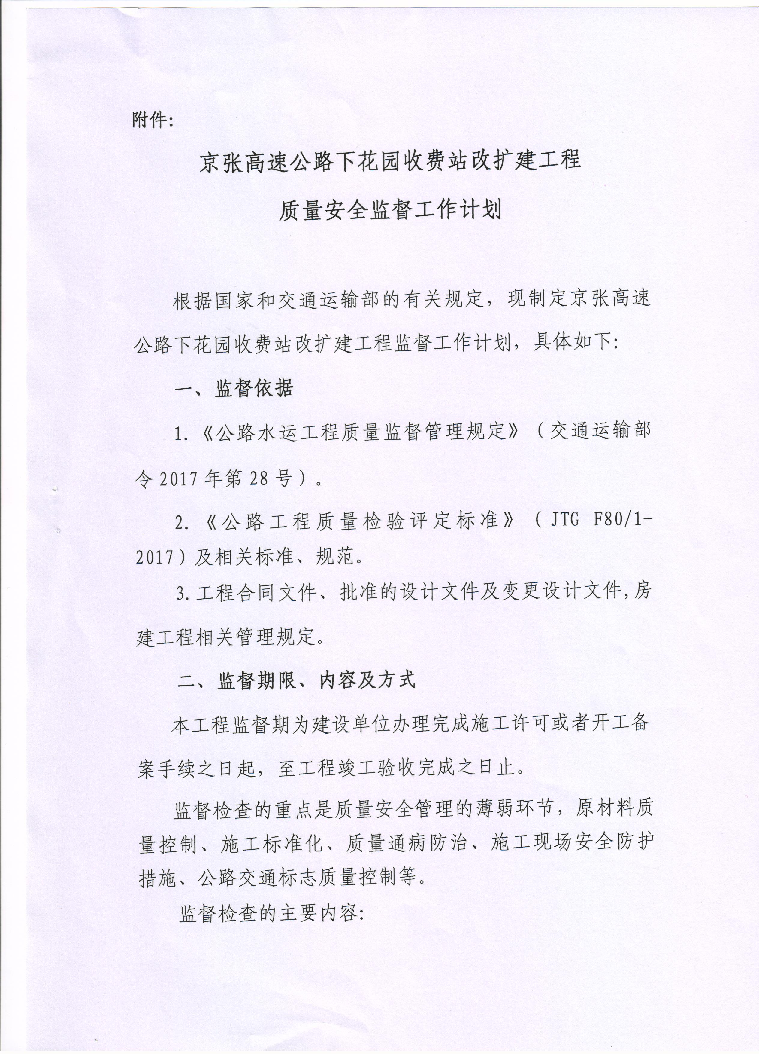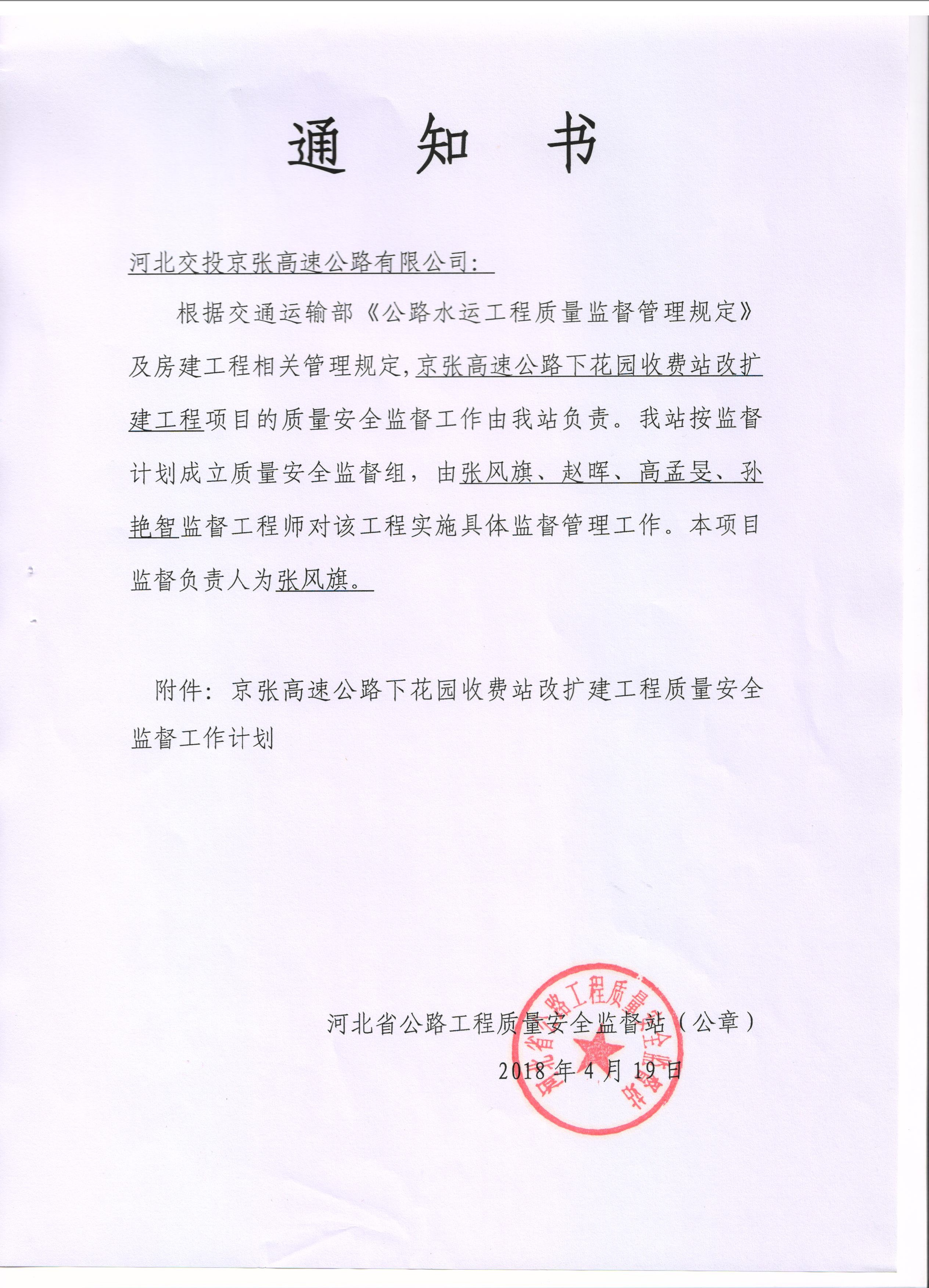 京張高速公路下花園收費(fèi)站改擴(kuò)建工程質(zhì)量安全監(jiān)督通知書(shū)